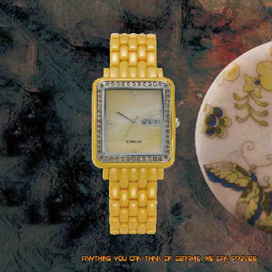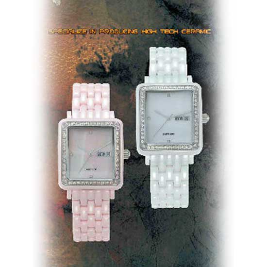 This is a quartz analog watch with a fashionable and elegant design. Its exquisite bracelet and quadrilateral case are completely made of quality ceramic with a highly glossy finish. The bezel is meticulously paved with a line of sparkling stones, adding a touch of luxury and glamor to this watch.