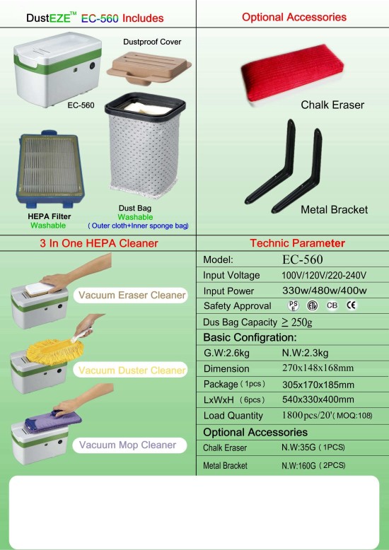 Revolutionary new patented, 9-stage DustEZE multifunctional chalk board eraser cleaner, not only suit for all kind of chalk / marker eraser clean ,but also suit for duster and dry floor mop dusting.