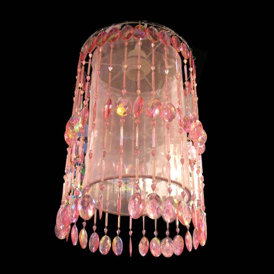 This is a pale pink coloured chandelier decorated with pink coloured oval shaped sparkling plastic beads. The chandelier is cylindrical in shape.