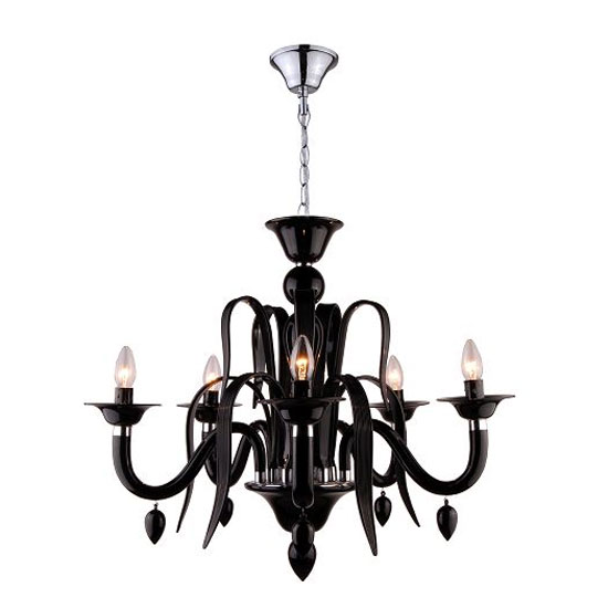 Showcased here is a charming chandelier light. Designed with a glossy black surface, this chandelier is sophisticated. Adornments in the shape of hanging leaves give this light a mysterious touch.