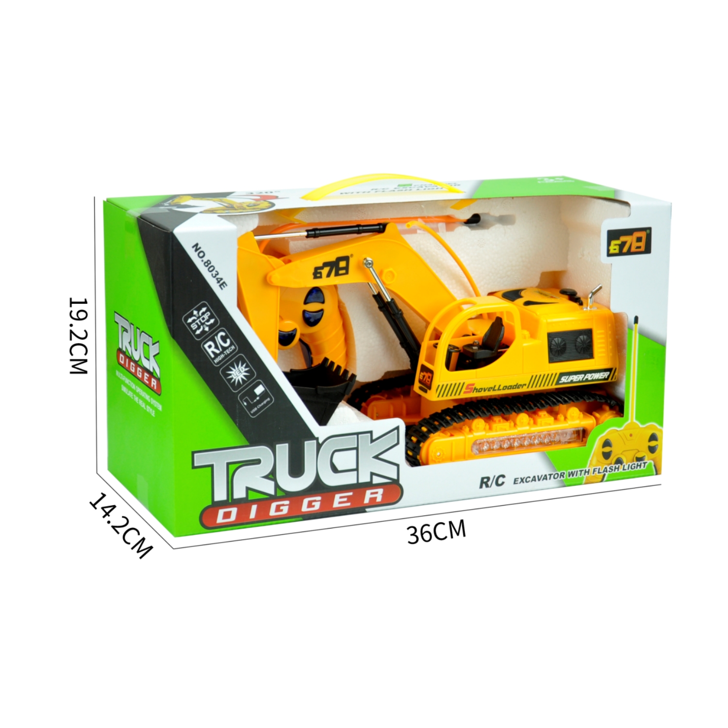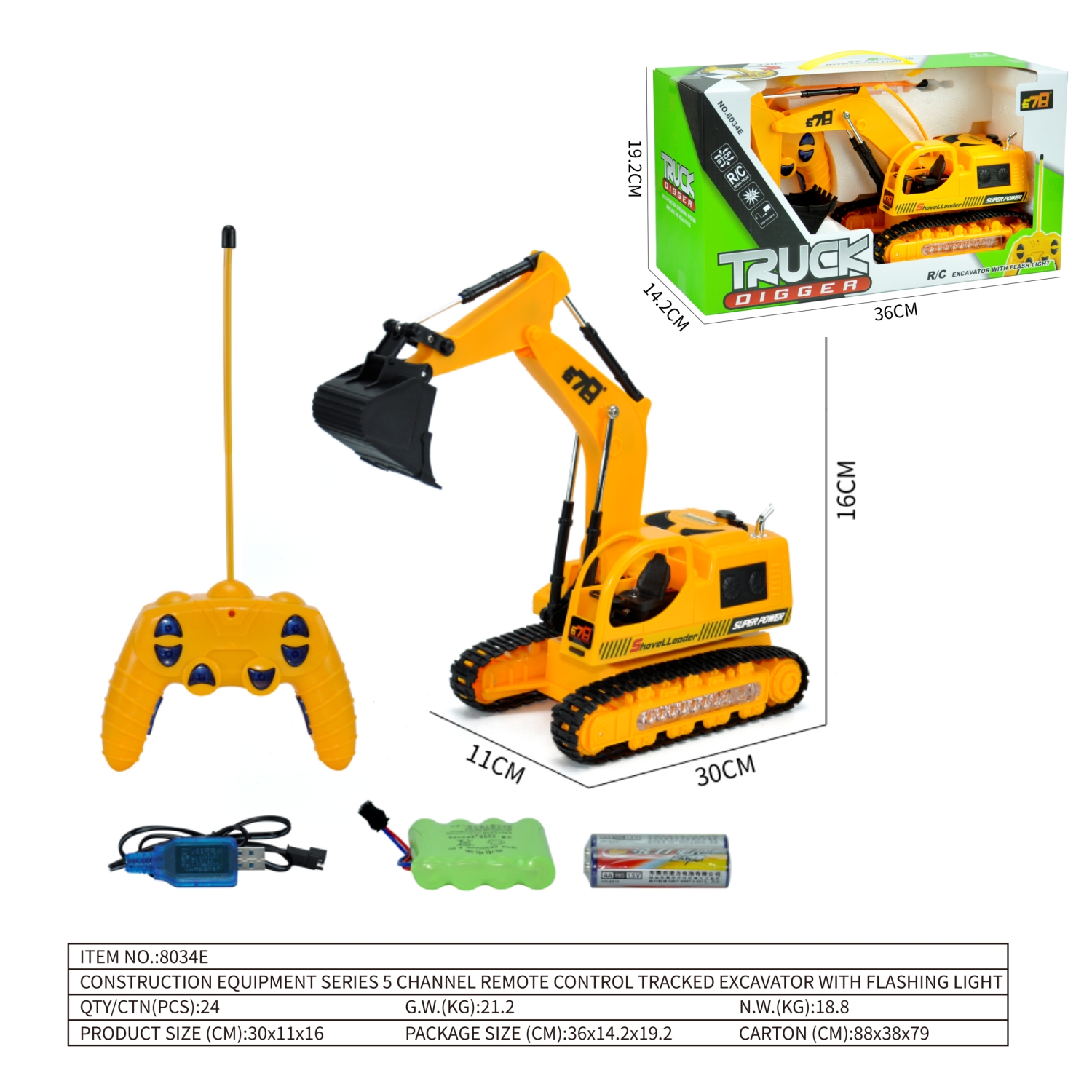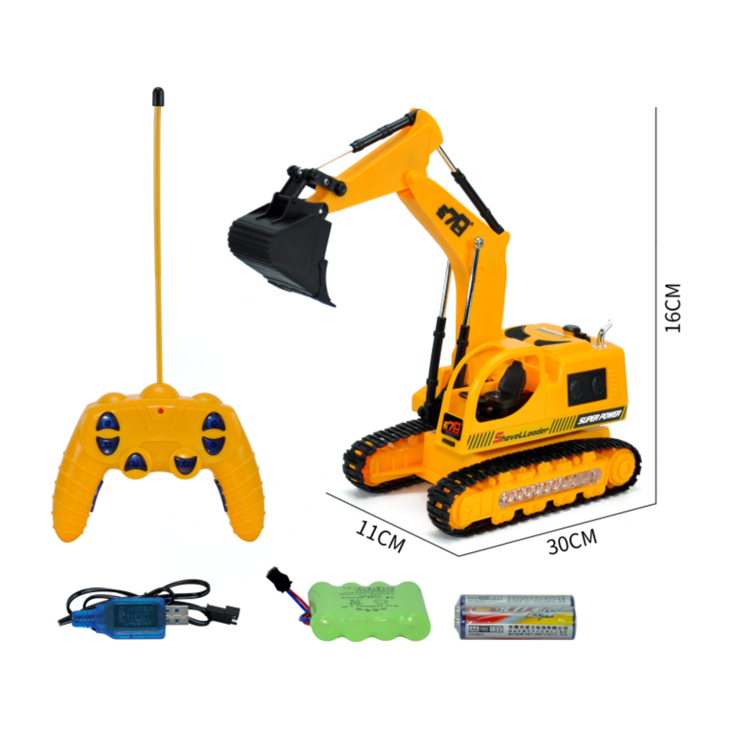 excavator*1, remote controller*1, 4.8V rechargeable batttery, AA non-chargeable battery*2, USB charging cable*1