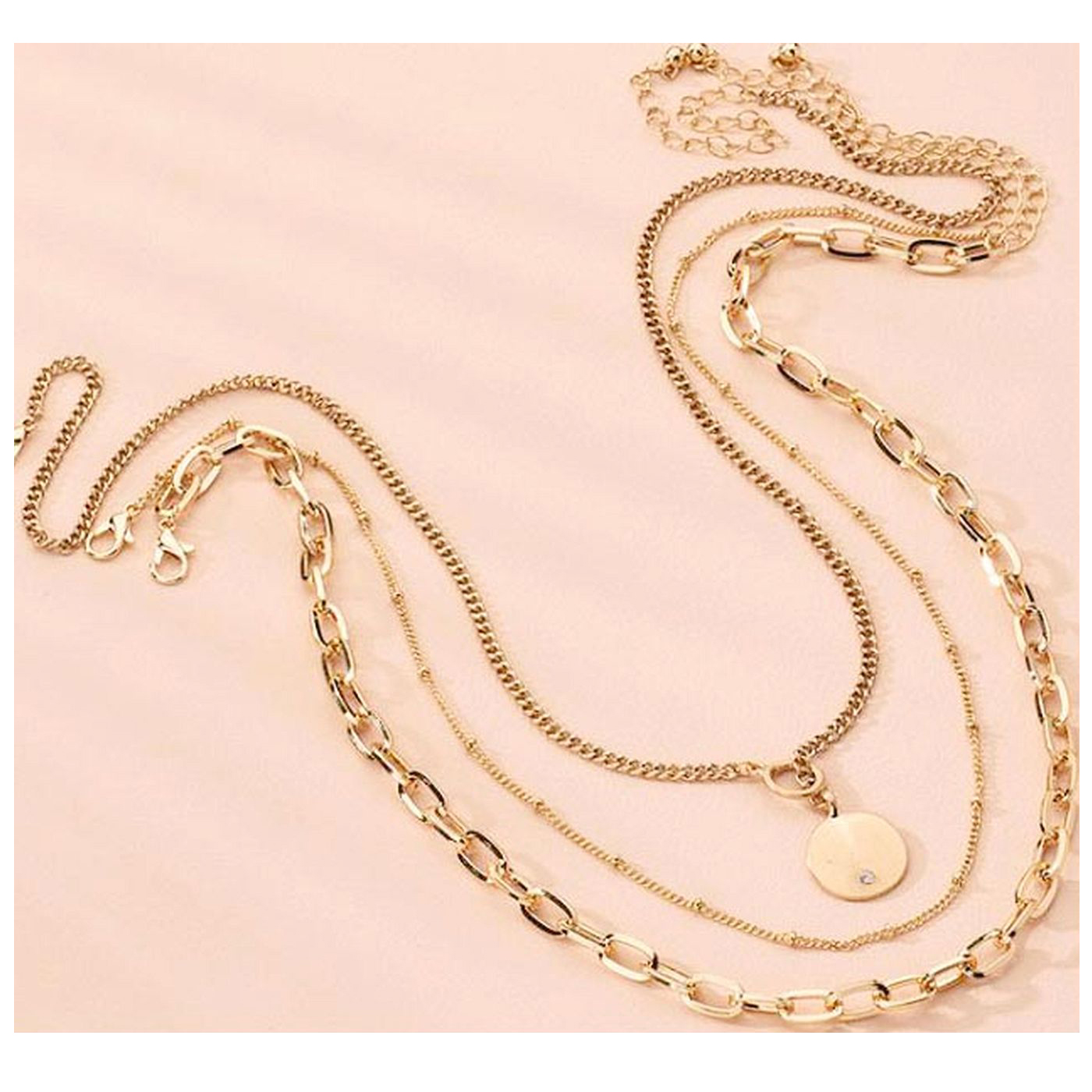 As shown is an elegant trendy necklace with multiple strands each highlighted by golden plated chains.