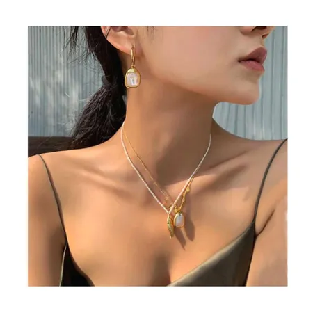 As shown is an elegant trendy necklace with multiple strands and drop earring each highlighted by metallic accessories.