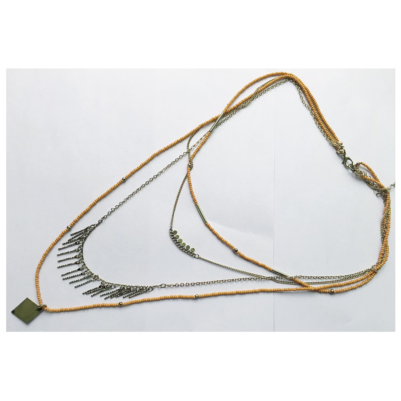This is a trendy necklace highlighted with multiple strands by silver plated with plastic beads.