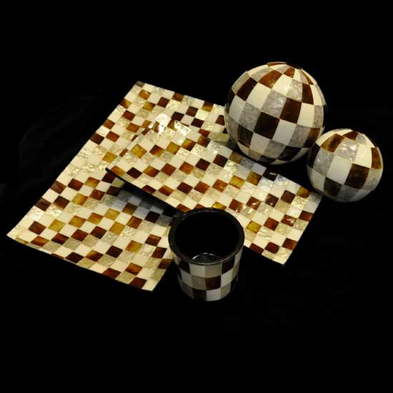 Showcased here is a tableware set that comes with a beautiful design. The set includes a cup, a tray, a plate and two balls. The items are patterned with brown and white checkers.
