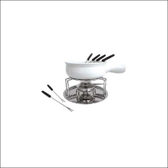 Cheese fondue set with 1 whie ceramic pot and 6 chrome forks with plastic handle.