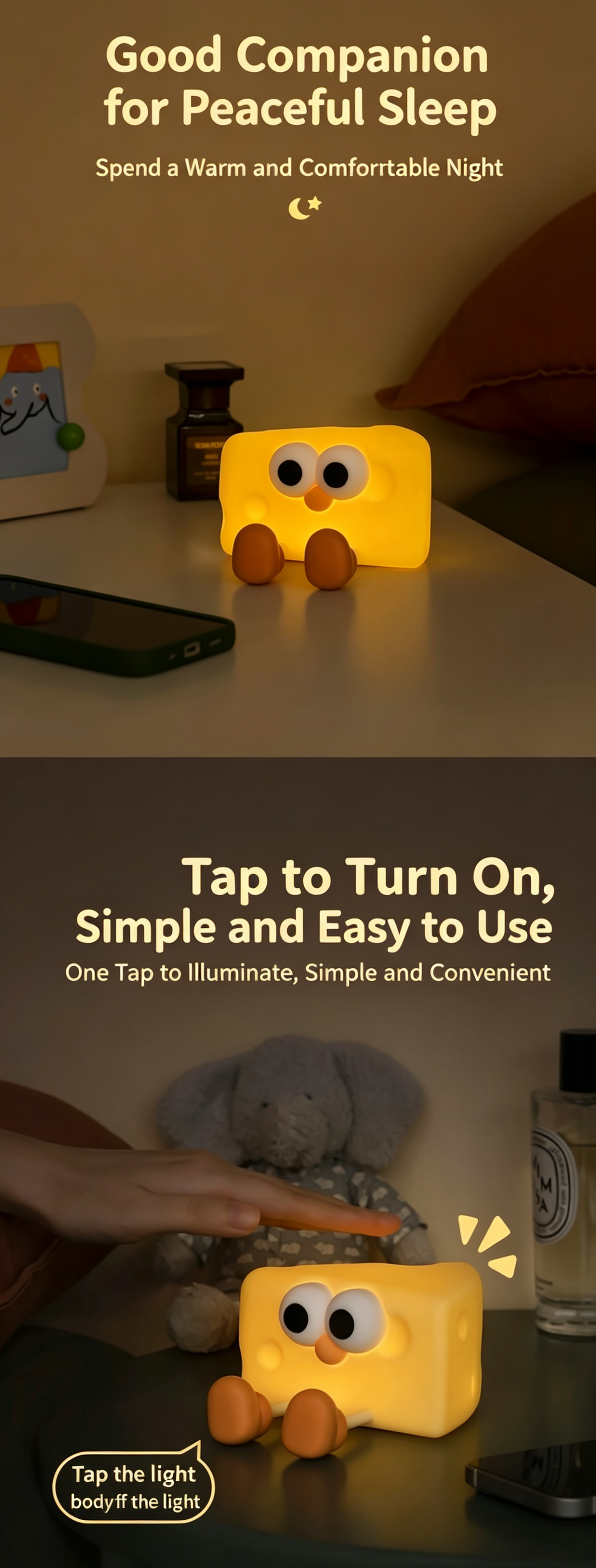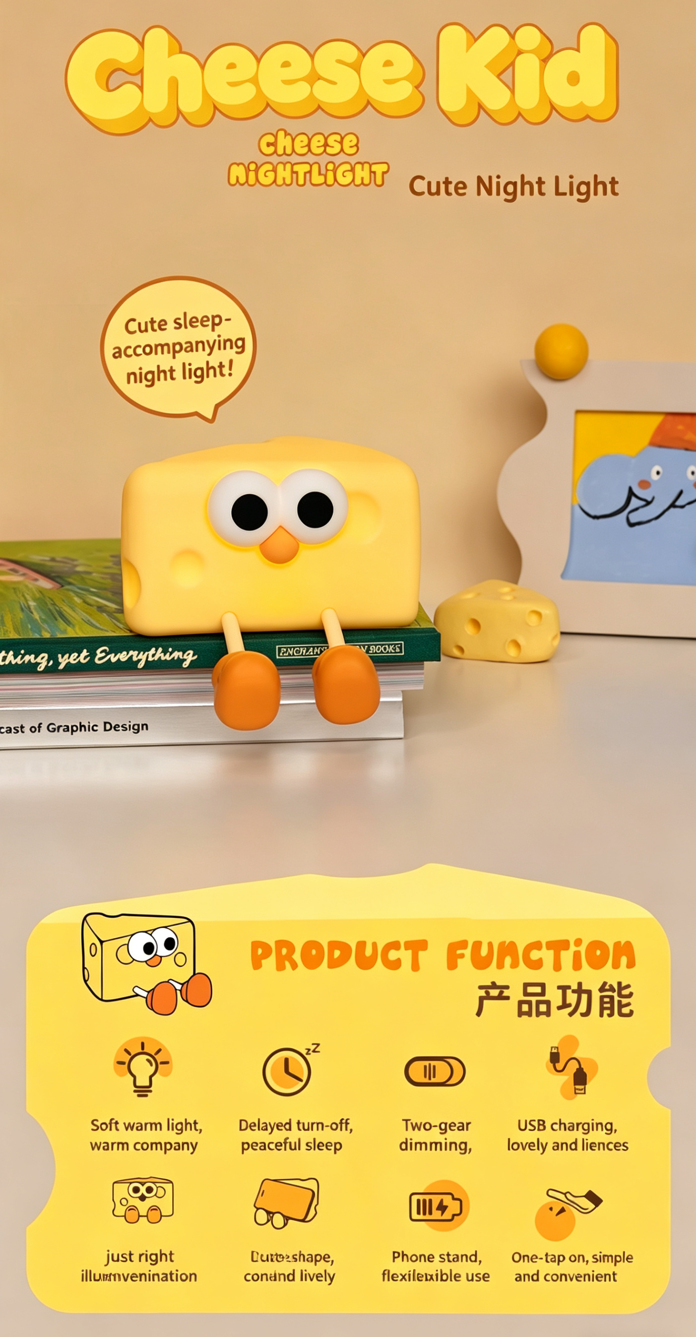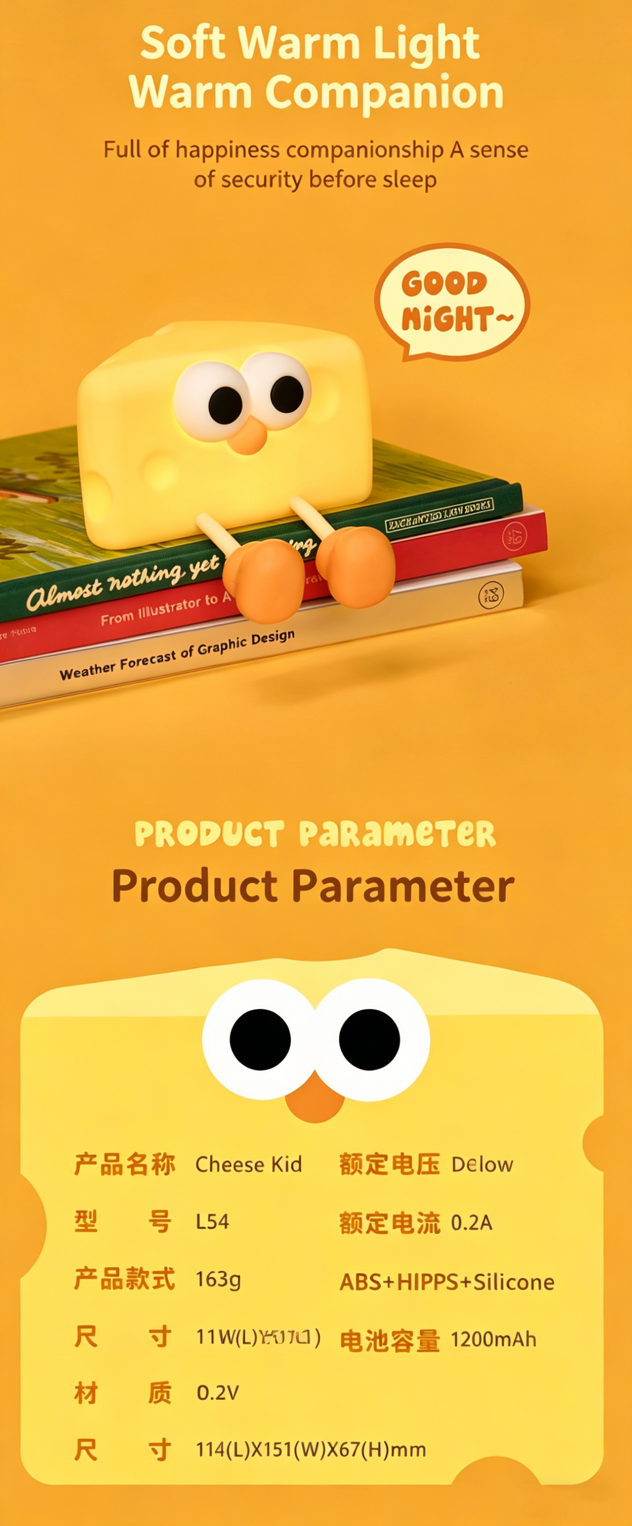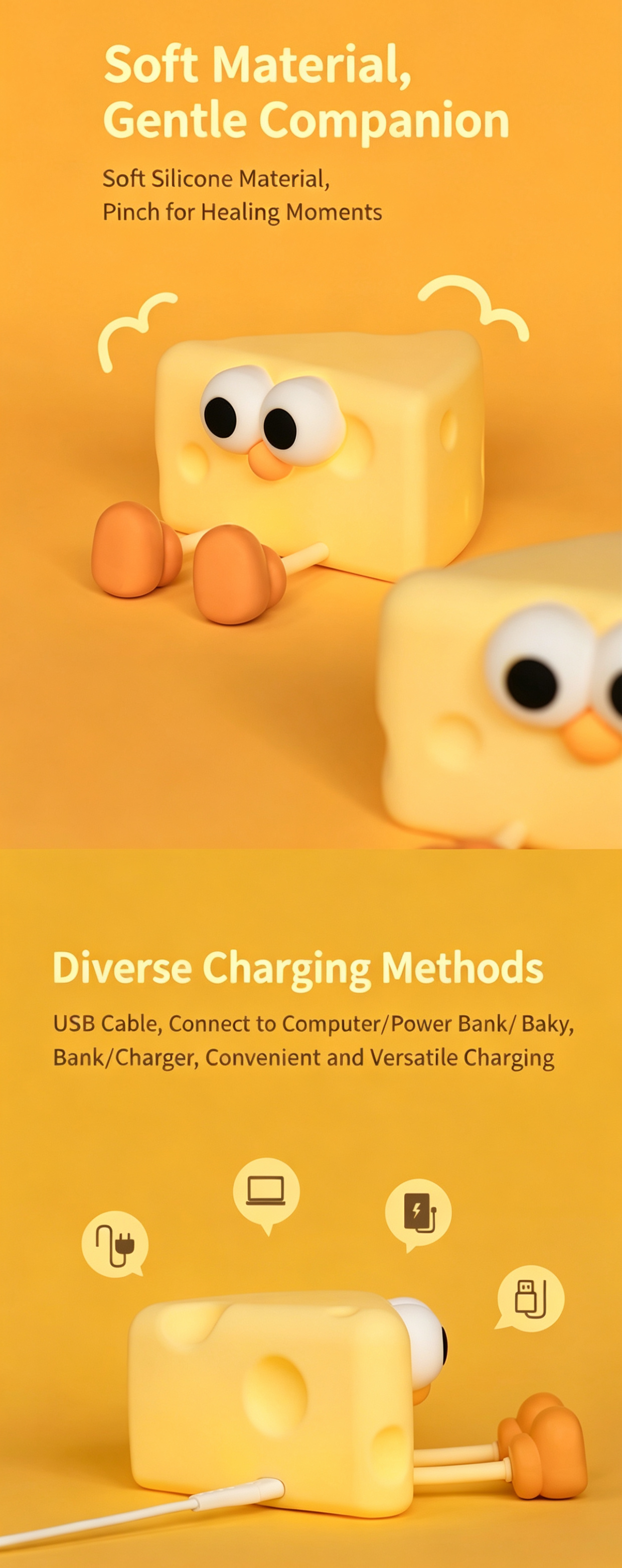 Meet your new adorable bedtime companion—the Cheese Boy Silicone Night Light! This charming cheese-shaped lamp combines a playful, cartoonish design with practical, kid-friendly features, making it the perfect addition to nurseries, bedrooms, desks, and more. Crafted from soft, safe silicone, it’s not just a gentle night light, but a stress-relieving squeeze toy, a handy phone stand, and a warm source of comfort for little ones (and parents!) during late-night feedings, bedtime, and beyond.
