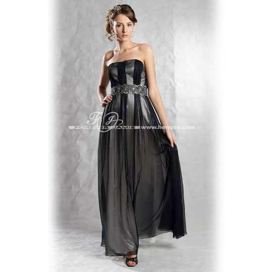 This is a black long evening dress with a tube neckline for showcasing your sexy shoulder bones. It is decorated with sparkling embellishments on the waistline for enhanced glamor. Add elegance and charm to your evening look with this exquisite evening dress.