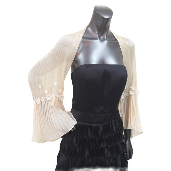Displayed is a pleated chiffon shawl that bestows you a sense of elegance and delicacy. Made of quality chiffon, this scarf is meticulously trimmed with lace flowers for added exquisiteness. Flaunting a flounced design, this refined lace chiffon shawl is a perfect complement to your evening dress.