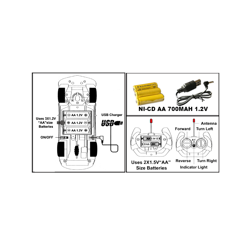 4. Product configuration: Remote control car * 1, remote control * 1, USB charging cable * 1, body battery * 1, packaging box * 1