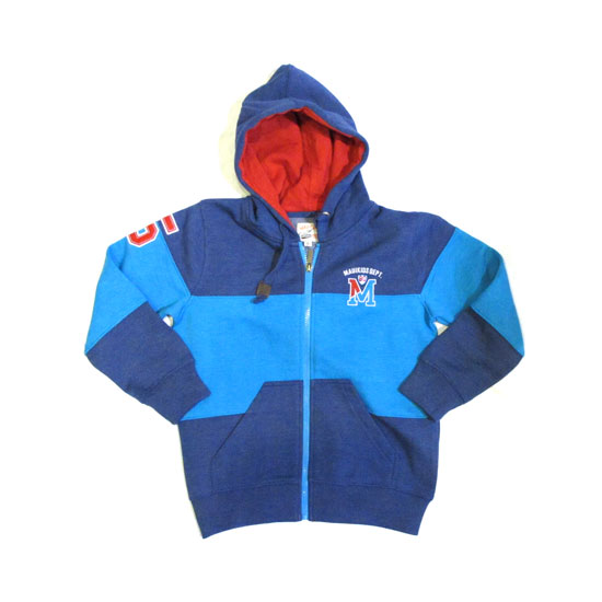 Designed with a zipper as the front closure, this children's hooded jacket is ready for kids to throw it on when they are heading to a sports ground to do sports. Contrasting with the red lining, this sea blue hooded jacket gives your kids a chic and smart look. Two multi-purpose pockets are designed on the front for you to carry small belongings.