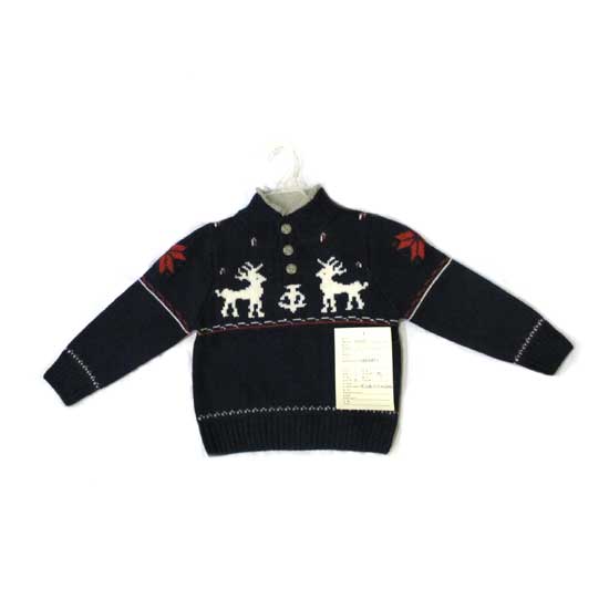 This is a children's pullover in dark blue with a button closure on the front. It is designed with contrasting patterns for added uniqueness. This sweater is made with excellent workmanship and attention to detail.