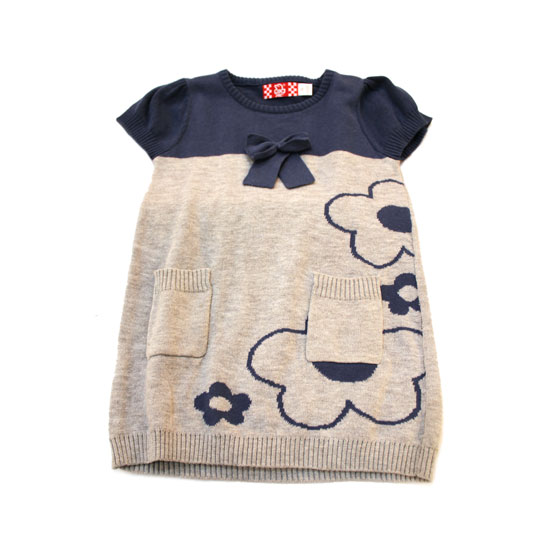 This is a children's pullover made of full cotton. It comes in gray with dark blow floral patterns. This pullover is adorned with a bow on the front and features two waist pockets.