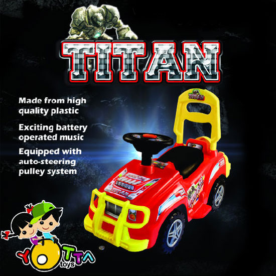 This children's ride-on car is made of high-quality plastic for enhanced durability. It will play exciting music to make driving more fun.  Equipped with an auto-steering pulley system, this car is easy to control.