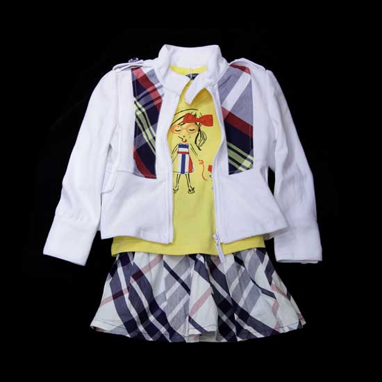 This children's suit comes with a jacket and a skirt. It is made of full cotton for enhanced comfort. The jacket is designed in pure white and checked patterns on the front and the skirt is crafted with allover checked patterns.