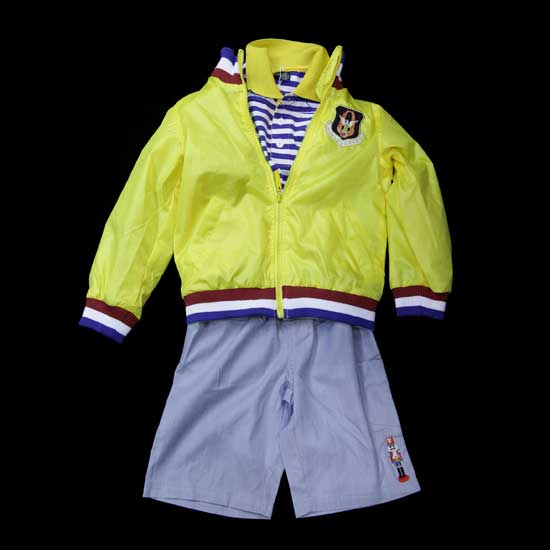 This is a children's suit that includes a jacket and a pair of shorts. The jacket is designed in bright yellow with a zip front closure and three-toned horizontal stripes on the collar, cuffs and hem. The short boasts a simple and neat design in light blue with a cute cartoon on the left leg.