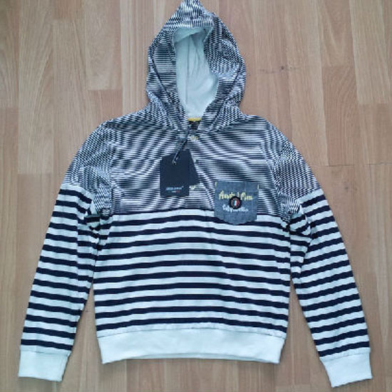 This is a children's sweatshirt that comes with fashionable stripe patterns. With a hood, this lightweight sweatshirt is woven and knitted for a comfortable touch. This high quality sweatshirt is easy to wash.