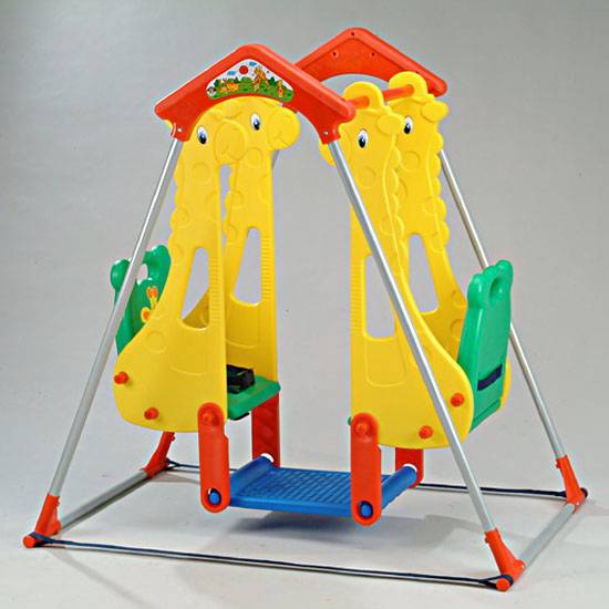 This is a toy swing set specially designed for children. The swing set features 2 plastic seats with giraffe-shaped frames. This fun item allows 2 young children to swing together face to face.
