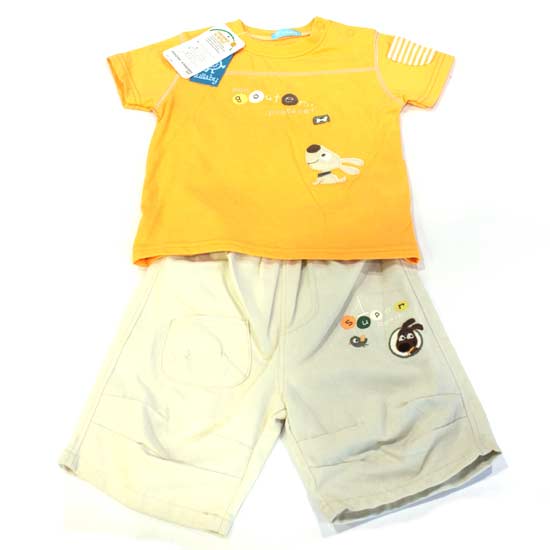 The design of this T-shirt and shorts set brings an energetic style to children. The short-sleeve T-shirt comes in sharp yellow with lovely puppy patterns, while the shorts are in light gray. The clothing features a soft and breathable texture for great wearing comfort.