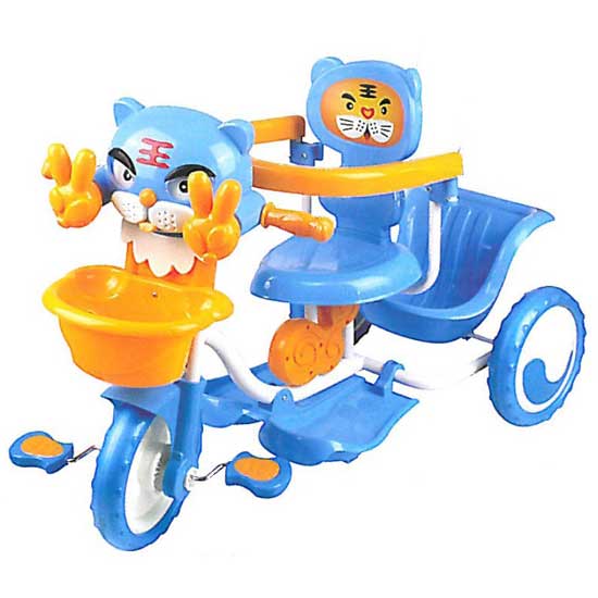 As shown is a tricycle designed for energetic children. The seat comes with a bumper to keep children from falling off. The cute tiger theme in addition to the sharp colors catches children’s attention easily.