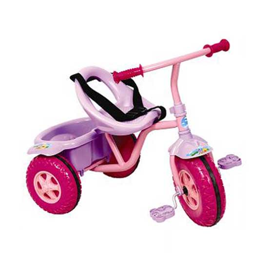 This cute children's tricycle features a pink and purple design. The large, sturdy wheels guarantee a safe and smooth ride for your children. The tricycle is designed with a rear basket to keep children's toys.