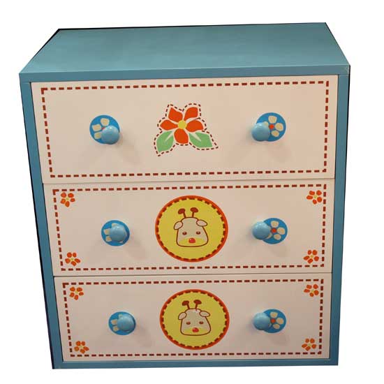 Displayed is a children's cabinet with 3-layer compartments. It is made of top-grade MDF wood with silk-screen printed patterns. This cabinet is sturdily built to ensure durable construction.