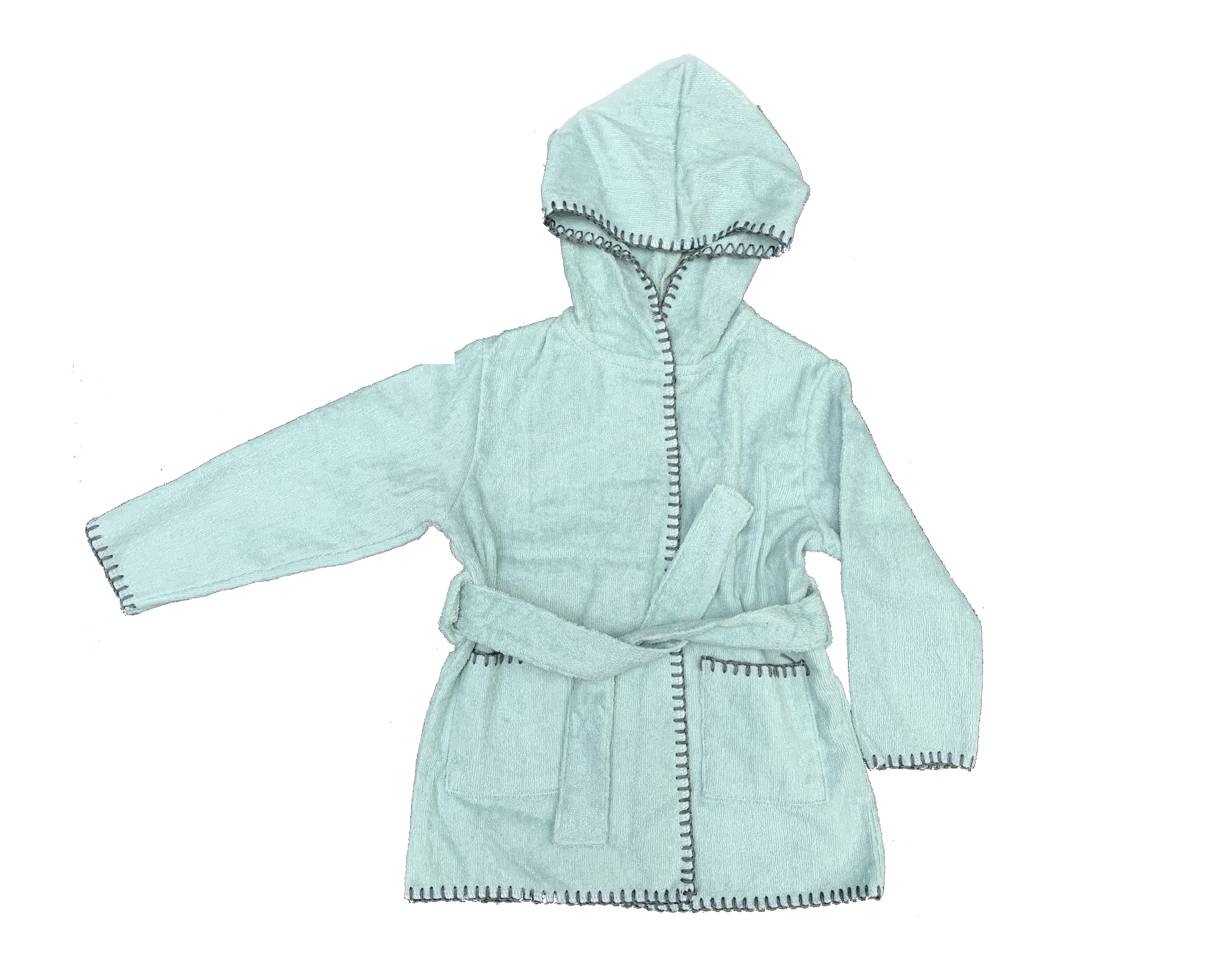 The children’s bathrobe is a quick and easy solution for drying the little ones after bathing. The robe is made of cotton woven terry fabric, it has long sleeves, a belt, a hood and pockets on the front, pretty decorative stitchings around the edges ! It can be used after bathing at home or when visiting swimming pools or the beach.