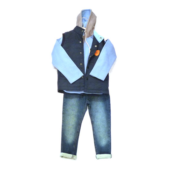 This childrenswear set comes with a hoodie, a jacket and a pair of jeans. The jacket features a sleeveless design and a button-up closure. This childrenswear set is made of quality materials for maximum comfort.