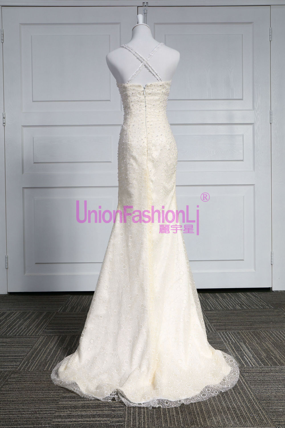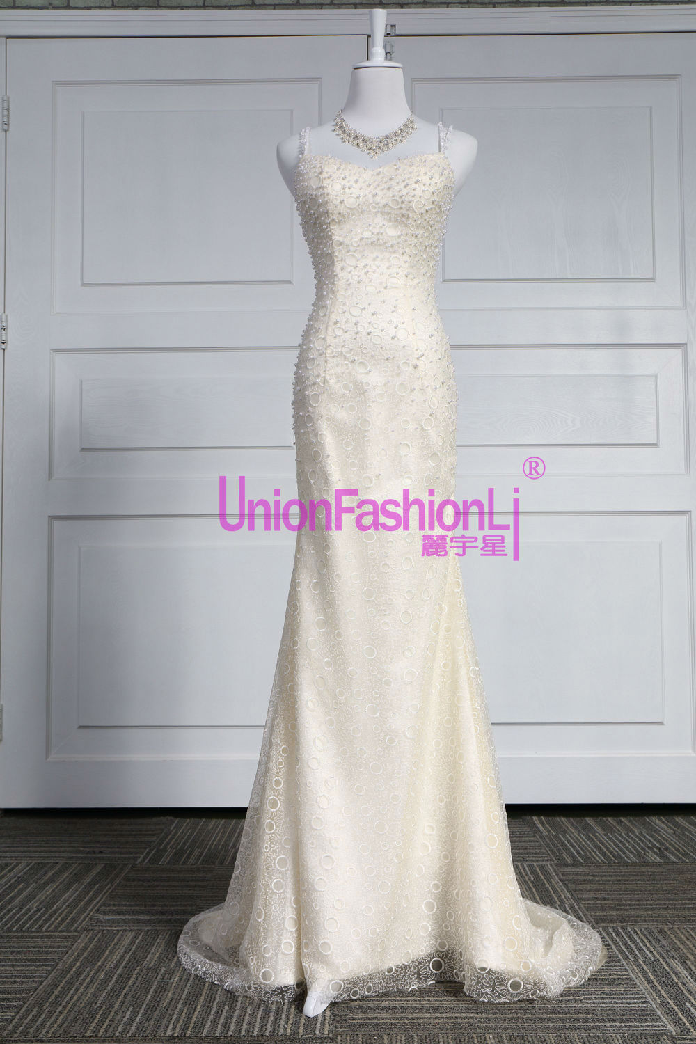 This new style 2016 romantic pearl beaded wedding dress features is pearl spaghetti straps slim wedding dress. It's made in China garment factory Union Fashion Dress Co.,Ltd which wholesale all over the world.