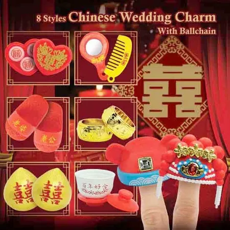 This Chinese wedding charm set comes with 8 styles with each attached with a ball chain. It is constructed from high quality plastic for durability. This joyful wedding charm set is a novel wedding gift.