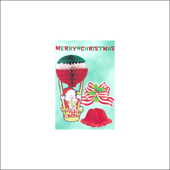 Wide variety of Christmas decorations including banners, garlands, honeycombs and cutouts.