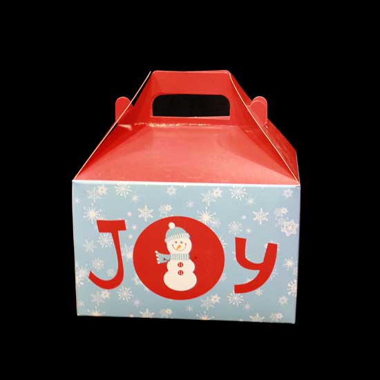 Displayed is a Christmas box featuring a big text of "joy" on the front with a snowman in the middle of the letter "o". Made of high quality paper, this box is folded to form a take-out box shape with the top and handles in red. This Christmas box is a good choice for presenting gifts during the holiday.