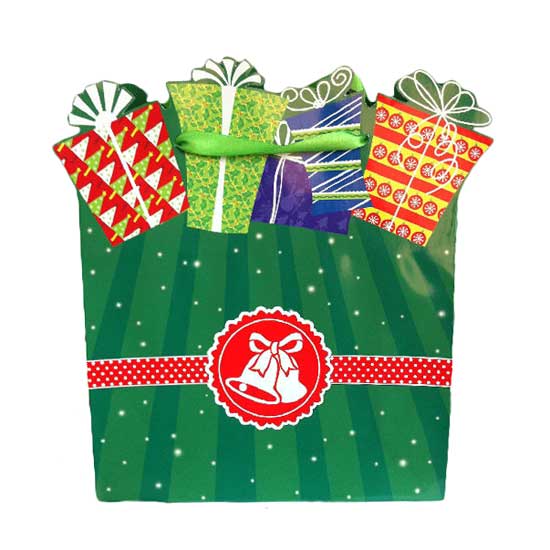 Displayed is a Christmas card that comes in a cheerful design. Featuring the theme colors of Christmas, this card has decorative parcel figures that extend outside the card, adding dynamics to the design. This Christmas card is made of high quality paper, making this a wonder gift for friends and families for the holiday.