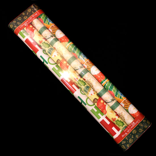 The picture displays 4 rolls of colorful Christmas gift wrapping paper. The wrapping paper is exquisitely printed with numerous Christmas symbols and patterns, creating a Christmas atmosphere. It is a perfect item to wrap gifts for your family, friends and loved ones during Christmas season.