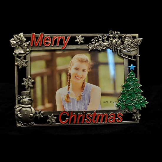 This gorgeous photo frame features a Christmas motif, with embossed metal ornaments such as snowflakes, a snowman, and a Christmas tree on the rectangular alloy frame. The frame fits standard 6" x 4" photos. Give your favorite photograph a refreshing festive look with this beautiful Christmas photo frame.