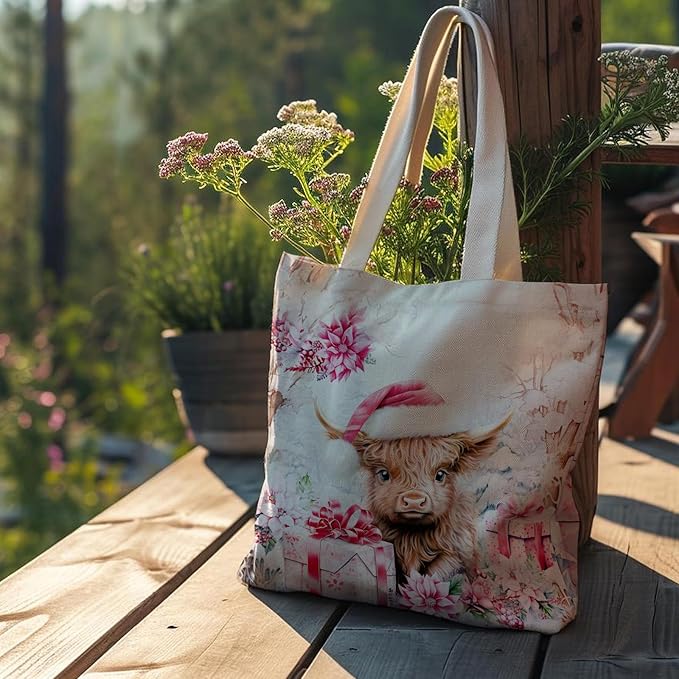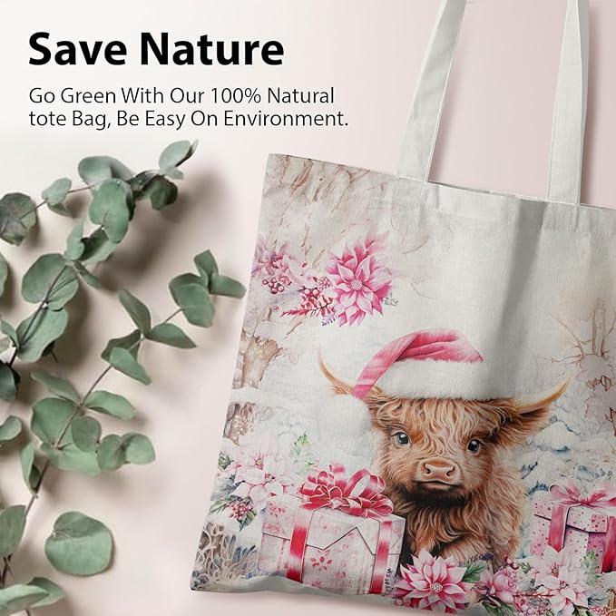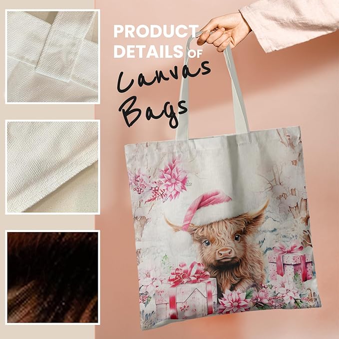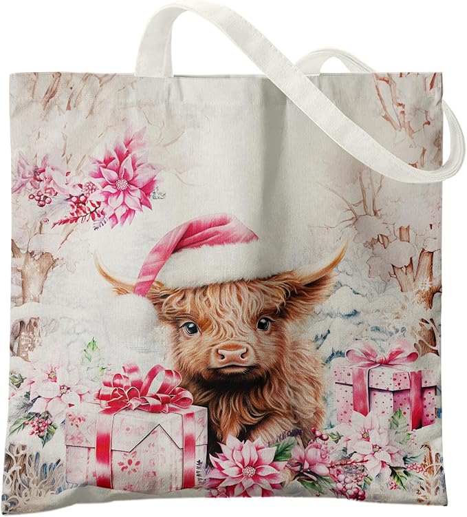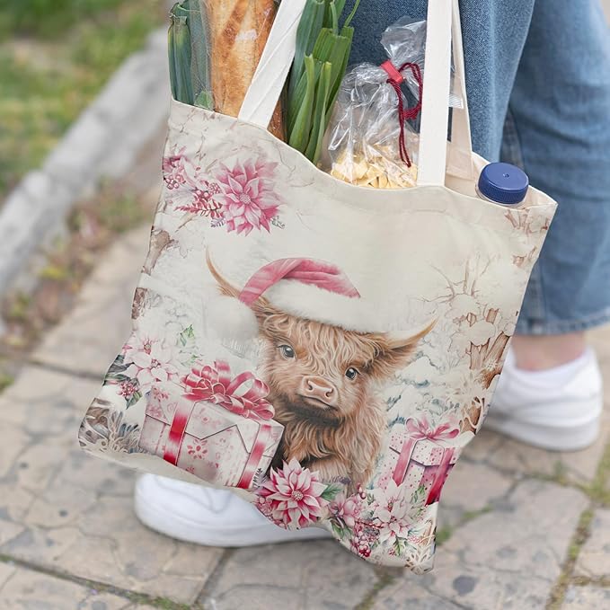 Christmas Santa hat Highland Cow Canvas Tote Bag