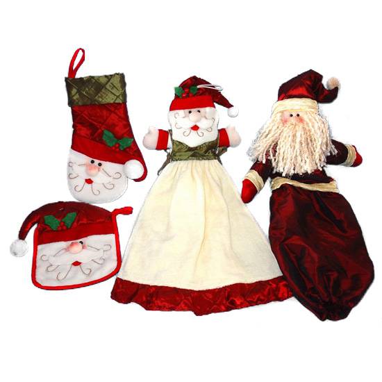 These are Christmas textiles with the face of Santa Claus Hand. They include a towel, a pot holder, an oven mitter and a polybag holder which are practical in use for everyday life, and also greatly enhance the festive atmosphere.