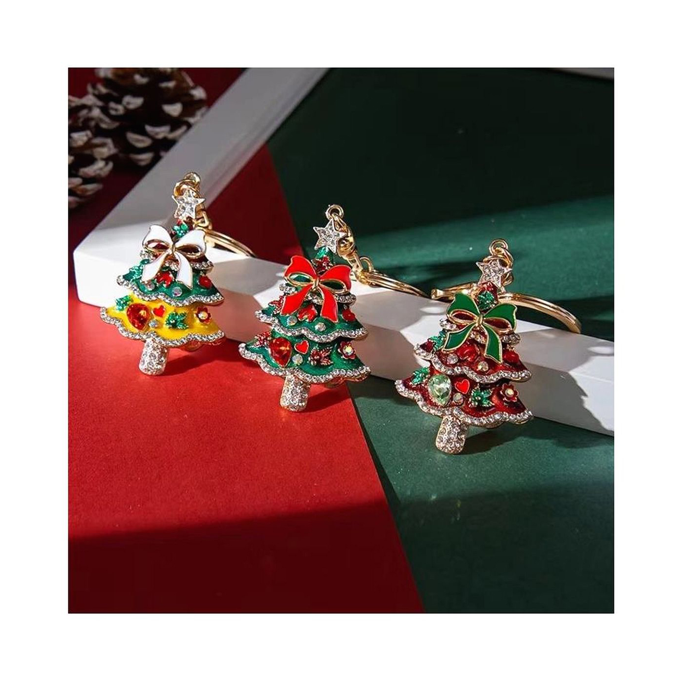 This is a piece of delicate golden plated key chain highlighted by the Christmas tree to match the festive season.