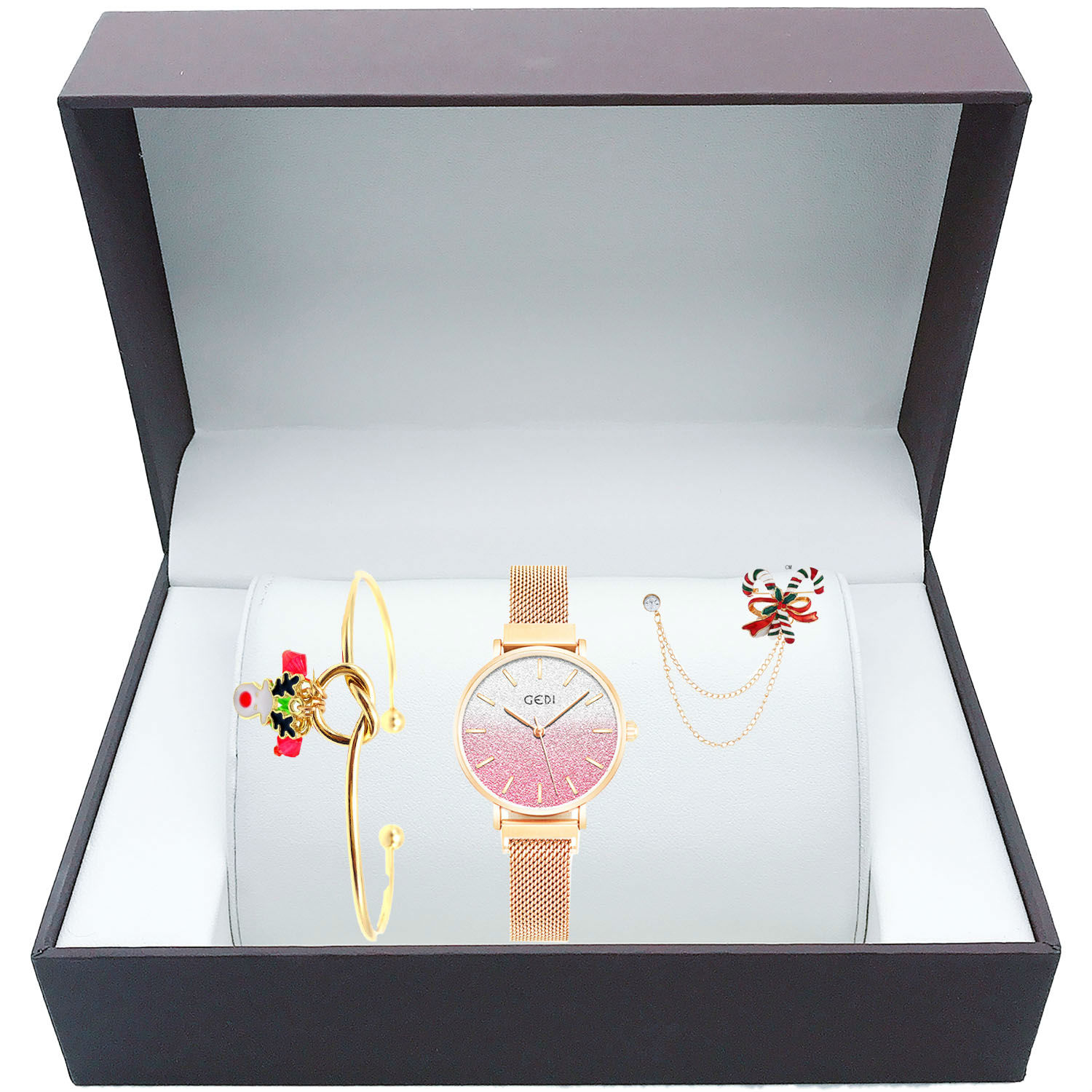 Highlighted here is a Christmas Watch Gift Set consisting of a 1 ATM Water-resistant Ladies Fashion Watch with Stainless Steel mesh band. The watch Alloy case & Steel Mesh band are IP plated and the Imitation Jewellery made of Brass material.