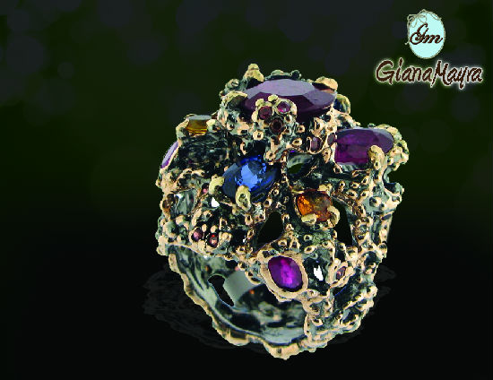 Chromed silver, rubies, blue sapphire, citrine, fancy stones