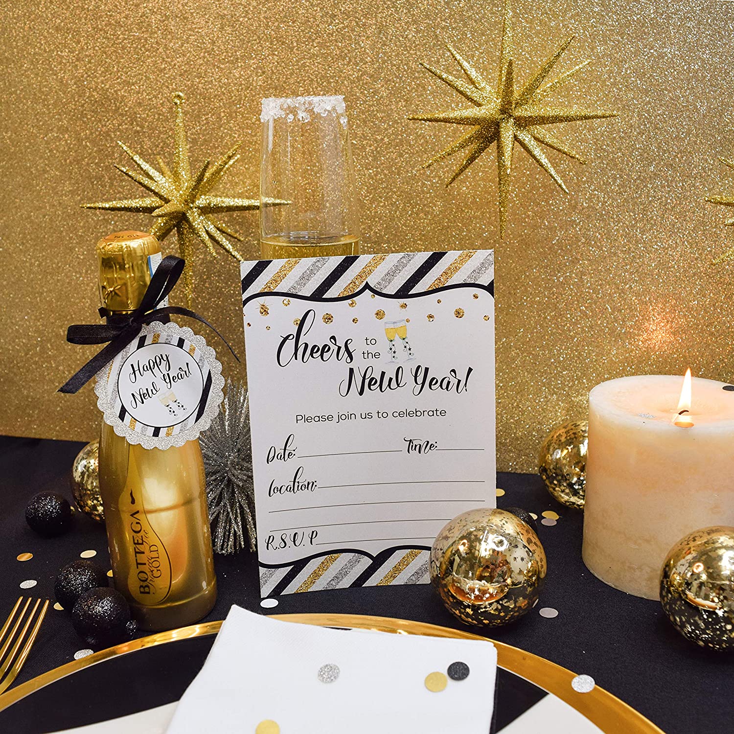 • Printed on high quality white gloss stock and features a trendy Happy New Year design.