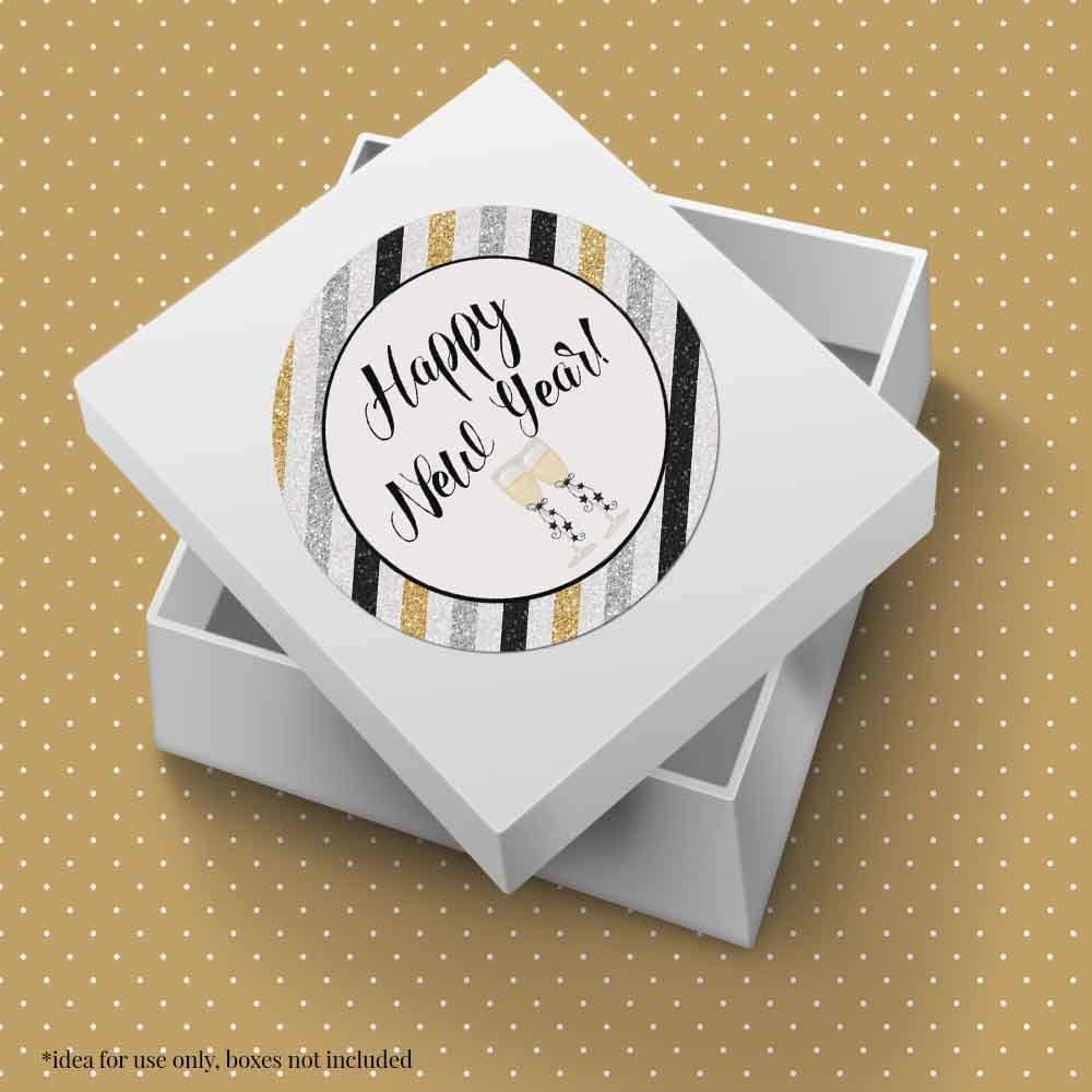 • Each Happy New Year label features a permanent adhesive that sticks to paper, plastic, cardboard, bags, fabric and glass.