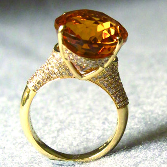 This is a stylish finger ring that features a large citrine gemstone as the centerpiece. The allover shimmering diamonds are well mounted on the 18-karat gold setting. This finger ring shimmers with a high-gloss finish.