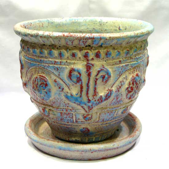 The showcased plant pot comes with an artistic design. Its exterior features patterns in different colors. The pot looks as if it is from ancient times. It is made with exquisite craftsmanship.
