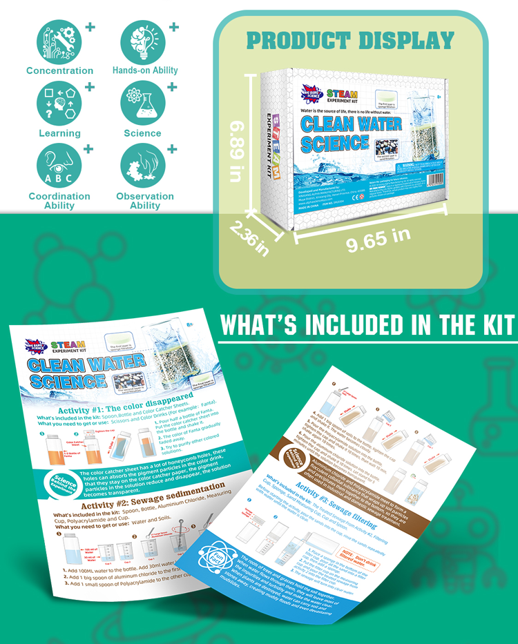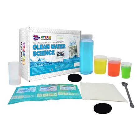 Clean Water Science Kit:  This kit can help kids learn about the science of cleaning and reusing dirty water with the Clean Water Science kit. You can build your own water treatment plant at your table. Perfect Science Toys: It is perfect for young science enthusiasts.The experiments in the kit can expand your children's knowledge in chemistry and the environment. Detailed instructions for each experiments and fun science facts are included.