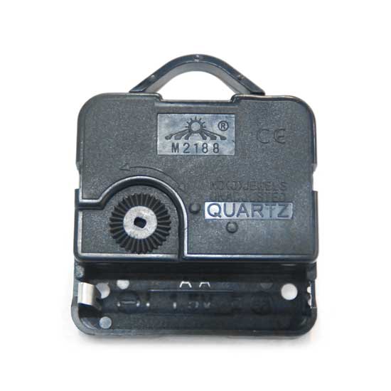 Displayed is a clock movement that uses quartz for accurate timekeeping. Featuring a plastic case, this movement is durable and easy to install. This clock movement uses an AA battery for power.