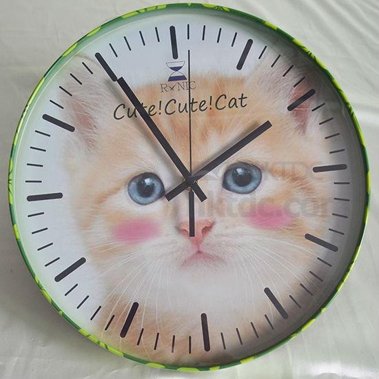 Featured here is a wall-mounted clock in a cat theme. This clock has all the necessities for a clear indication of time: stick hour markers, stick minute indexes and a 3-hand movement. Adorned with an innocent cat face print on the clock dial, this clock makes a practical and appealing addition to your home.