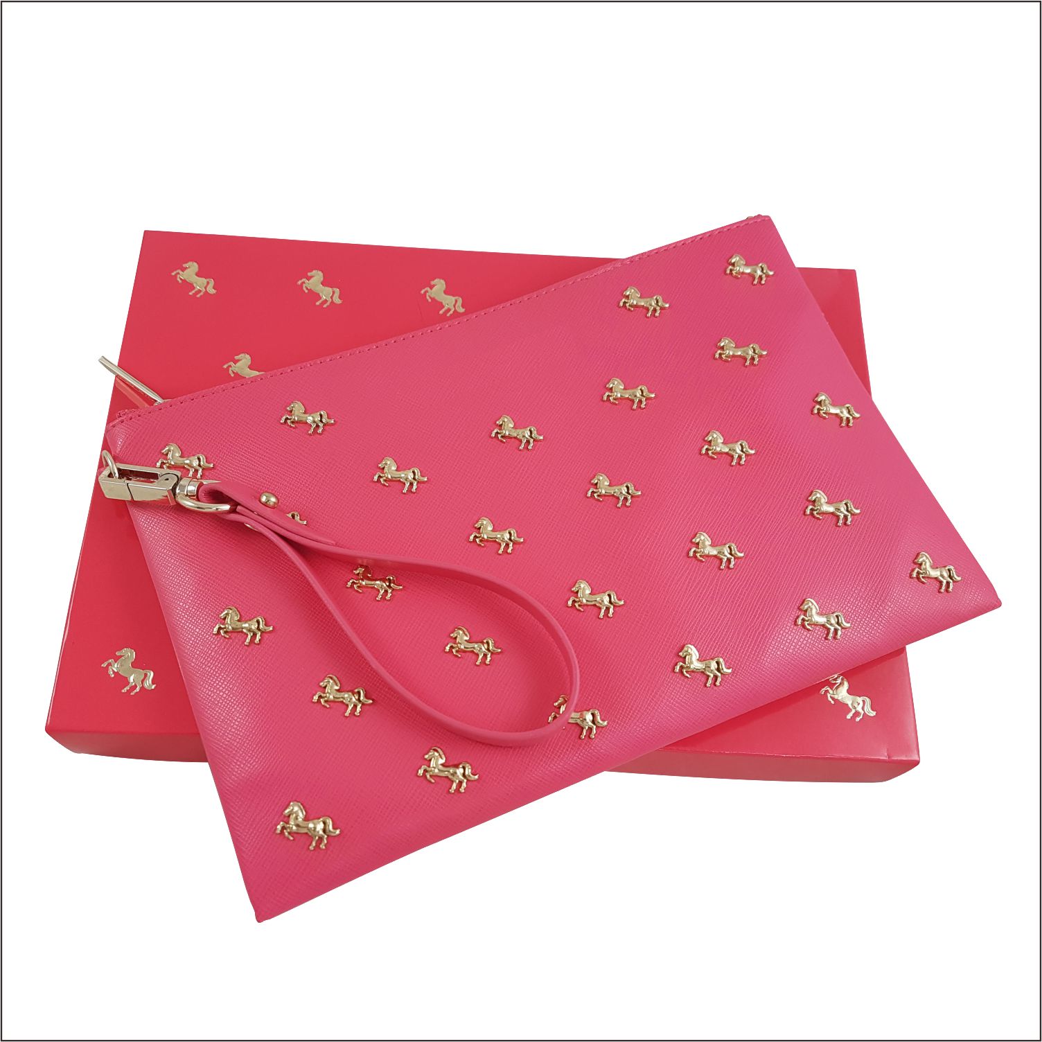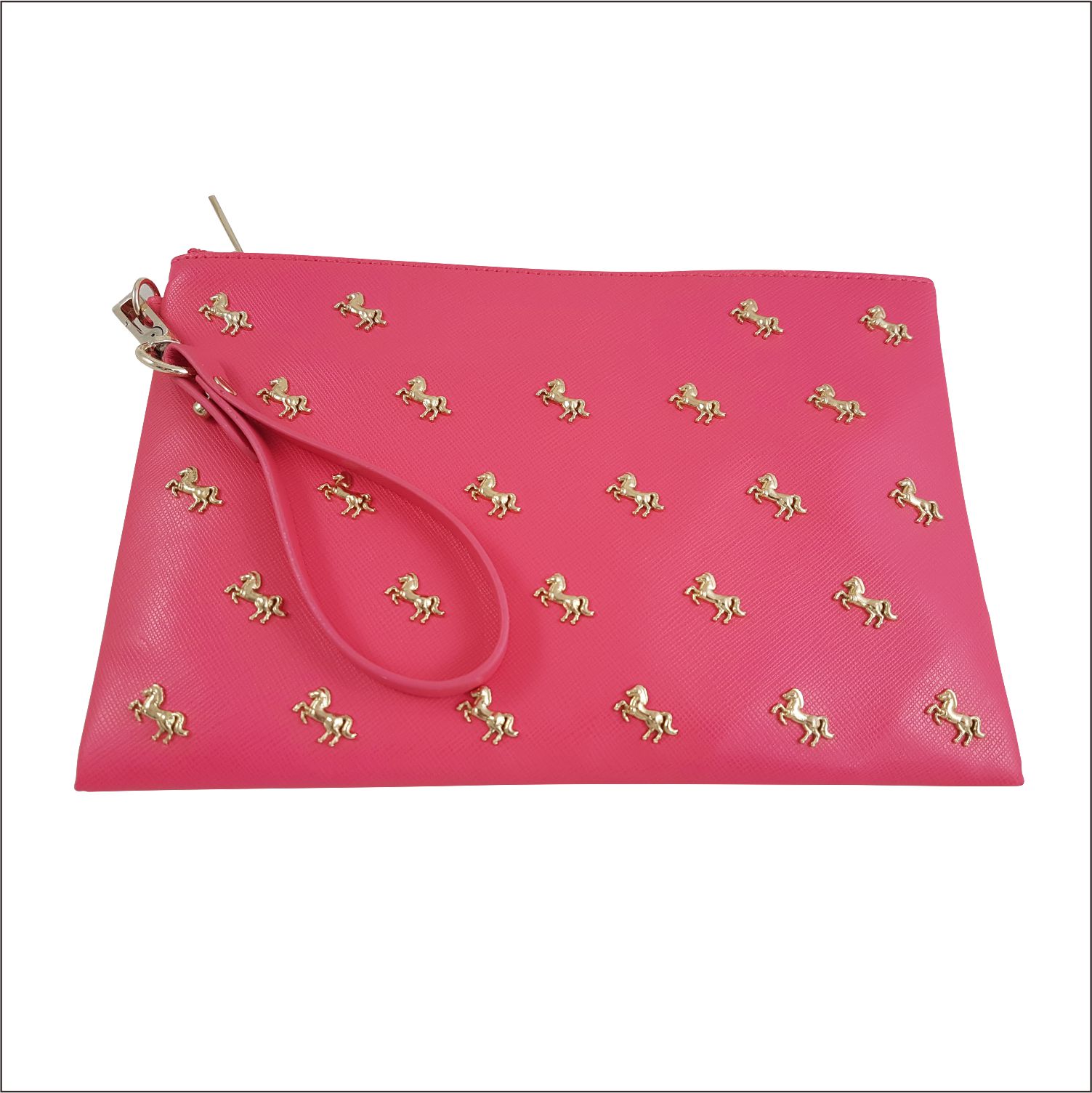 Elevate your weekend downtown outfit with this chic and refined clutch. Coming in a feminine and sharp color, this clutch is summery and fashionable. To infuse the casual piece with a luxurious air, gold-tone pony-like details are set on the bag. Cute and full of delicate details, this piece can complement a wide range of outfits from a simple white tee-shirt and jeans to a cocktail dress.