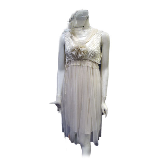 This elaborate cocktail dress makes you stand out from the crowd effortlessly. Made with a top part with a V-neckline and a textured surface, this dress is classy and elegant. Paired with a light, pleated skirt and a floral decoration in matching material, this dress is ideal for formal occasions.