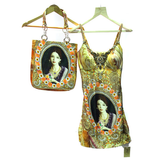 Featured here is a fascinating print cocktail dress and handbag set. The fabulous design comes with bold graphics of a beauty, floral patterns, beads and embroidery. This splendid set is a sexy and eye-catching choice for ladies.